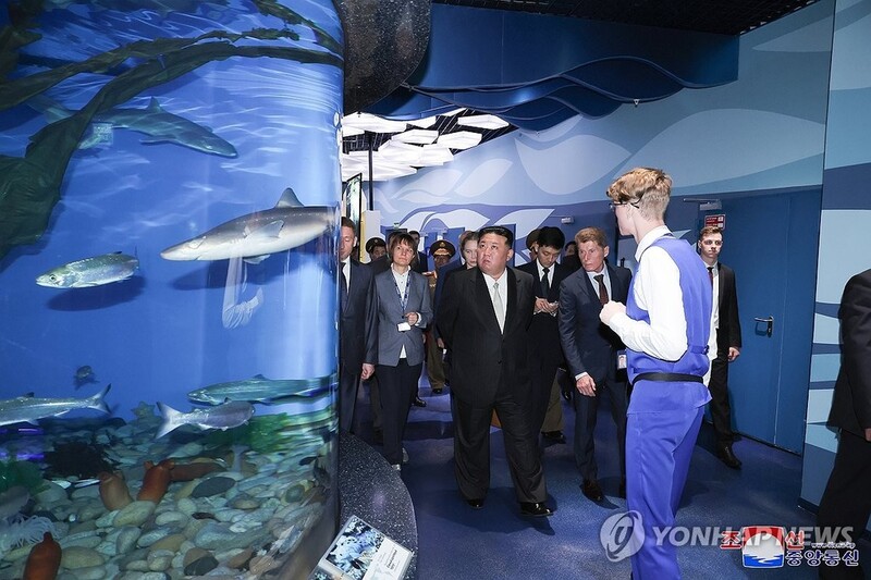 | ▲ North Korean leader Kim Jong-un (C) visits the Maritime Territorial Aquarium in Vladivostok, Russia, during his two-day stay at the city, in this photo released by the North's official Korean Central News Agency on Sept. 18, 2023. (For Use Only in the Republic of Korea. No Redistribution) (Yonhap) |