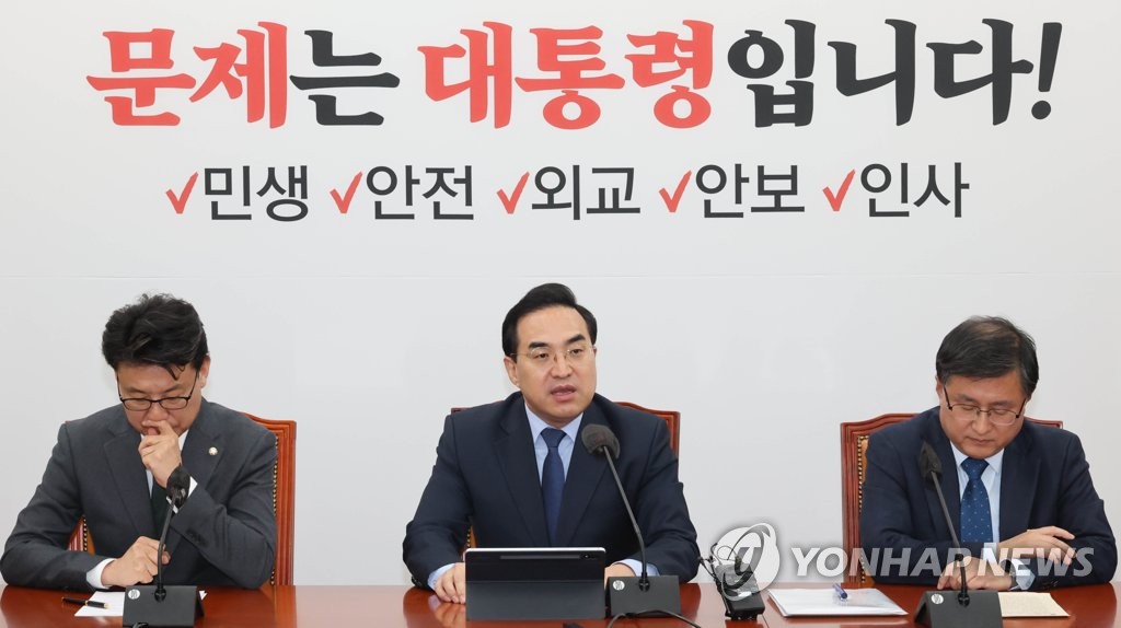 | ▲ The main opposition Democratic Party floor leader Park Hong-keun (C) speaks at a party meeting held at the National Assembly in western Seoul on March 7, 2023. (Yonhap) |