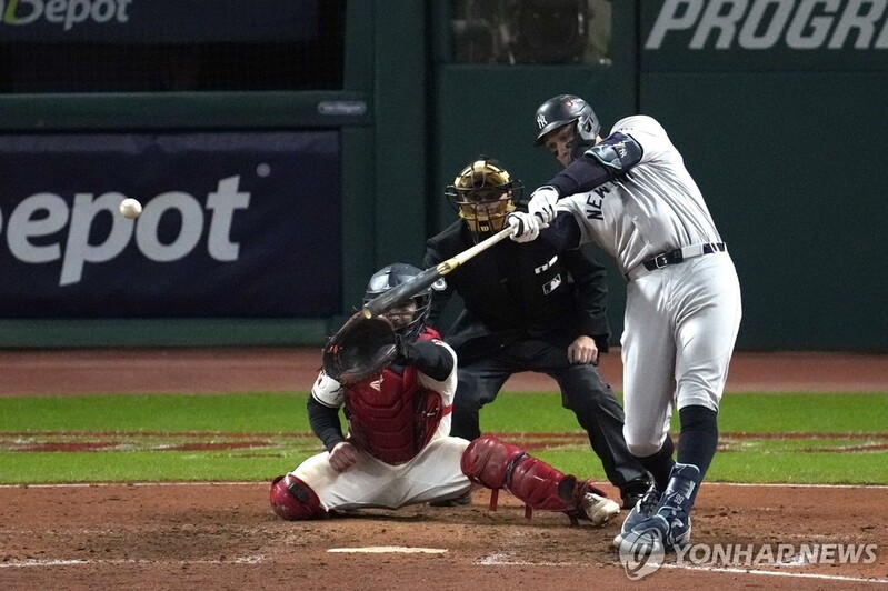 2사 1루에서 양키스 홈런왕 에런 저지가 클리블랜드 마무리 투수 엠마누엘 클라세를 두들겨 우월 동점 투런포를 쐈다.