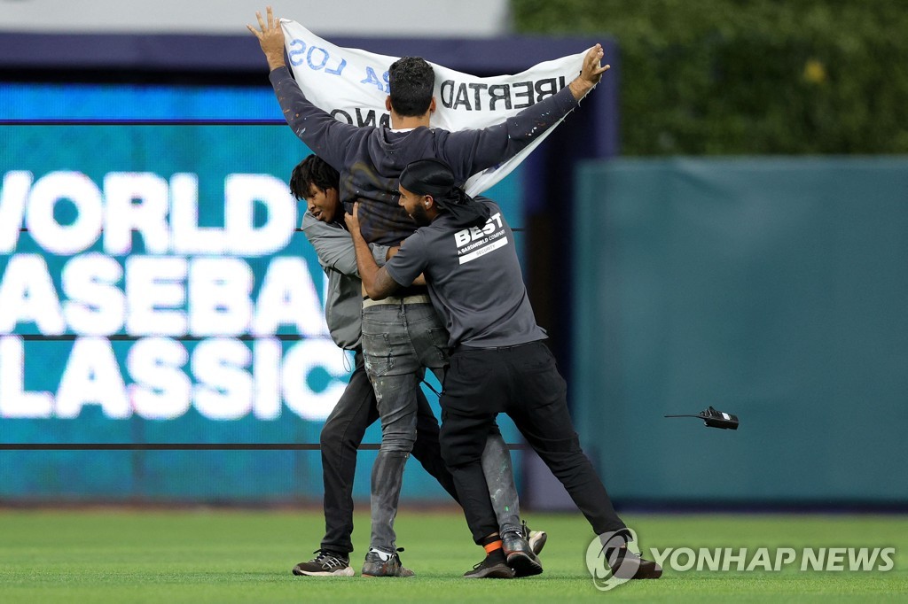 | ▲ 그라운드에 난입한 야구팬 한 야구팬이 20일(한국시간) 미국 플로리다주 마이애미 론디포 파크에서 열린 2023 월드베이스볼클래식 미국과 쿠바의 준결승 경기 6회에 메시지가 적힌 현수막을 들고 그라운드에 난입해 제지당하고 있다. [AFP=연합뉴스] |