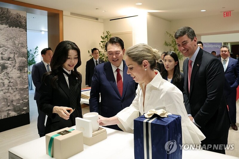 ▲ Kim Keon Hee (L), wife of South Korean President Yoon Suk Yeol (2nd from L), tells Leticia Ocampos (2nd from R), wife of Paraguayan President Santiago Pena, about a scented candle that she has made, during their talks over a luncheon in New York on Sept. 21, 2023. (Pool photo) (Yonhap)