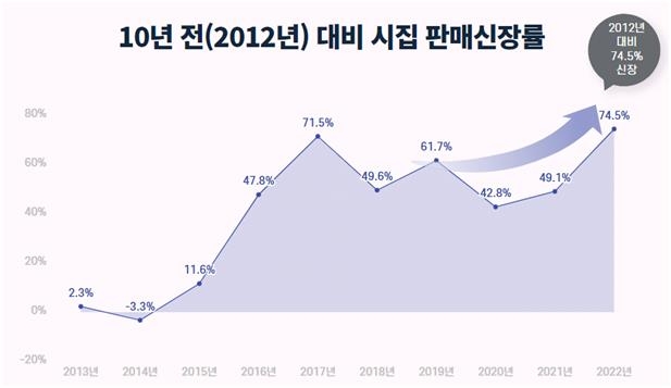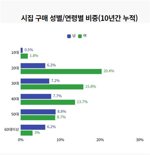 지난 10년간 시집 주독자층은 20대 여성이 20.4%로 가장 큰 비중을 차지했으며 30대 여성(15.8%), 40대 여성(13.7%), 50대 여성(8.7%) 순으로 조사됐다. 반면 남성은 50대가 8.8%로 가장 많았으며 40대(7.7%), 30대(7.2%) 순이었다.