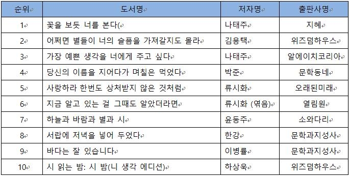 | ▲ 최근 10년간 시집 판매 순위 10위(2012년 11월 28일~2022년 11월 27일) [교보문고 제공] |