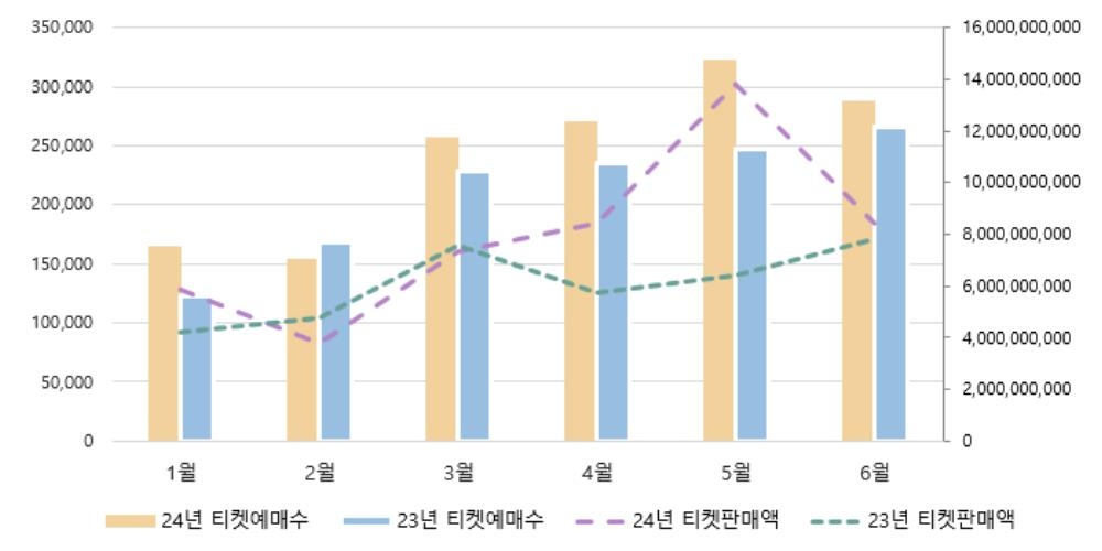 반면 2020년부터 4년간 티켓 판매액 1위를 기록했던 뮤지컬은 올해 상반기 374만1천여장의 티켓을 팔아 매출액 2천188억5천여만원을 기록해 2위로 처졌다. 지난해 상반기와 비교하면 티켓 판매 수는 3.4%, 판매액은 3.3% 감소했다.