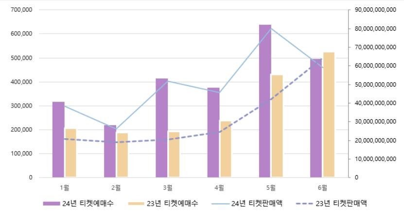 | ▲ 2023∼2024년 상반기 대중음악 공연 월별 티켓 예매수 및 티켓 판매액 [예술경영지원센터 제공. 재판매 및 DB 금지] |