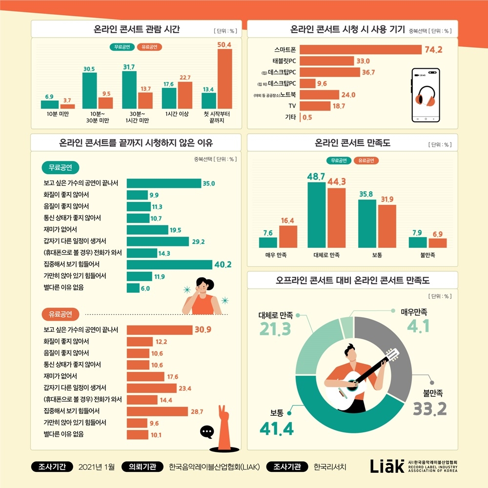 그러나 오프라인 콘서트와 비교한 온라인 콘서트의 만족도는 보통(41.4%)과 불만족(33.2%) 비율이 높았다.