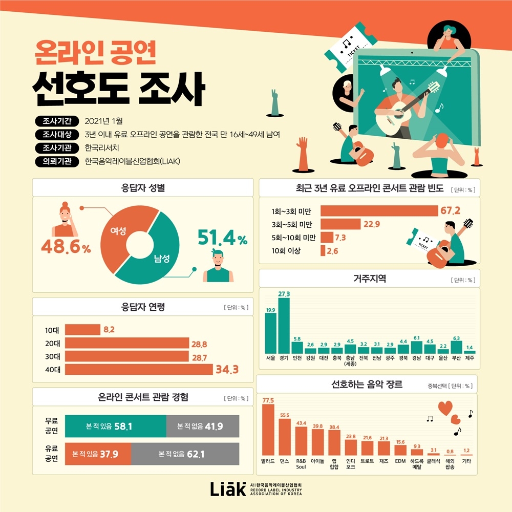 한국음악레이블산업협회(이하 음레협)는 지난달 한국리서치에 의뢰해 실시한 온라인 공연 선호도 조사 결과를 16일 공개했다. 조사는 3년 이내에 유료 오프라인 공연을 관람한 전국 만 16세∼49세 남녀 1천 명을 대상으로 이뤄졌다.