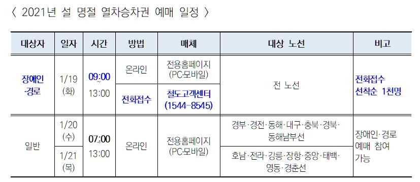 20∼21일에는 경로·장애인을 포함한 모든 국민이 PC나 모바일 등 온라인으로 설 승차권을 예매할 수 있다.