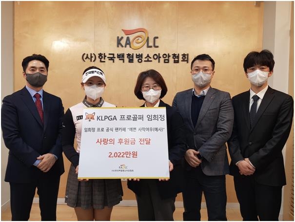 (서울=연합뉴스) 한국여자프로골프(KLPGA)투어에서 4승을 거둔 임희정(22)이 팬클럽 '예사' 회원들과 함께 마련한 2천22만 원을 25일 한국백혈병소아암협회에 기부했다.