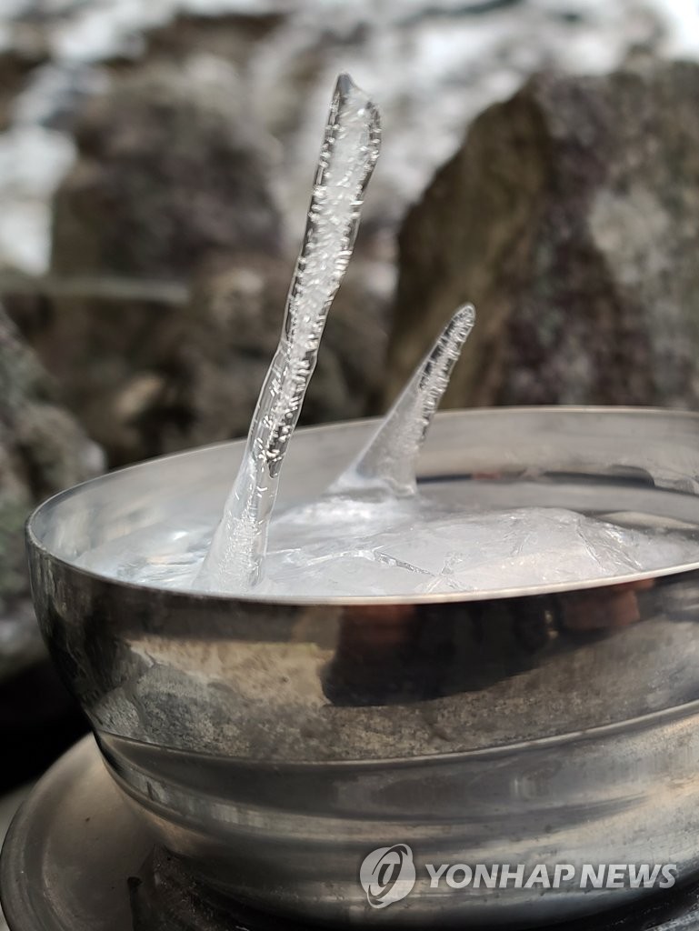 (진안=연합뉴스) 19일 전북 진안군 마이산 탑사 내 정화수 그릇에 역고드름 2개가 맺혀 눈길을 끈다.