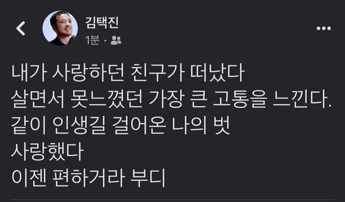 김 대표는 일부 공개로 올린 이 글에서 "같이 인생길 걸어온 나의 벗 사랑했다. 이젠 편하거라 부디"라고 명복을 빌었다.