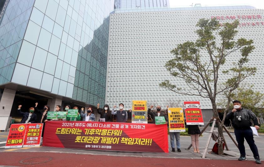 ▲ "드림타워, 제주 에너지 다소비 건물 1위" (제주=연합뉴스) 전지혜 기자 = 탈핵·기후위기 제주행동이 18일 오전 제주시 노형동 드림타워 앞에서 지난해 기준 제주지역 에너지 다소비 건물 현황을 공개하며 에너지 소비를 줄이기 위한 대책 마련과 시행을 촉구하고 있다. 2022.4.18 atoz@yna.co.kr
