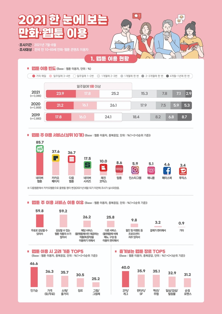 웹툰 이용률은 전년보다 3.5%p 증가한 66.9%, 출판만화 이용률은 5%p 증가한 33.8%로 최근 3년간 꾸준히 증가했다.