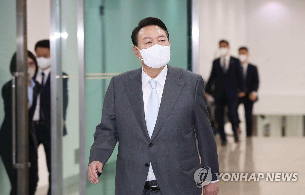 ▲ President Yoon Suk-yeol heads to his office in Seoul on June 15, 2022. (Pool photo) (Yonhap) |
