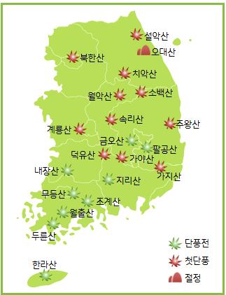 | ▲ 25일 오후 현재 날씨누리에 공개된 전국 유명산 단풍 현황 [기상청 날씨누리 캡처. 재판매 및 DB 금지] |