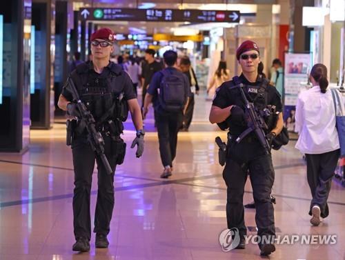 ▲ Special operations police officers patrol at a Seoul subway station on Aug. 7, 2023, amid a surge in online murder threats in the wake of recent back-to-back deadly mass stabbings. (Yonhap)