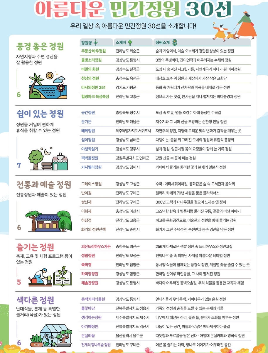 이번에 선정된 민간정원은 정원별 특색에 따라 ▲ 자연 지형을 잘 활용하거나 바다·호수 전망이 아름다운 '풍경 좋은 정원' ▲ 산책과 휴식하기 좋은 '쉼이 있는 정원' ▲ 우리나라 전통정원이거나 음악과 미술을 담은 '전통과 예술정원' ▲ 교육·체험 프로그램을 운영하거나 축제가 열리는 '즐기는 정원' ▲ 분재·열대수목 등 독특한 볼거리가 있는 '색다른 정원' 등 5개 주제로 구분돼 있다.