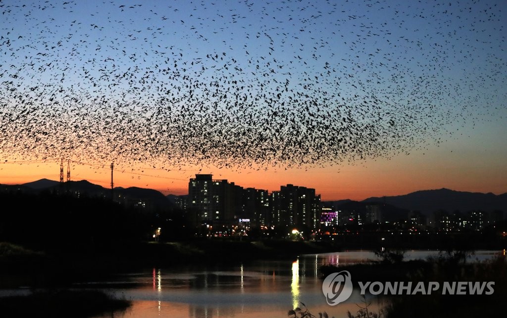| ▲ 태화강 상공 뒤덮은 떼까마귀 울산 태화강 상공에서 떼까마귀가 노을을 배경으로 환상적인 군무를 펼치고 있다. [연합뉴스 자료사진] |