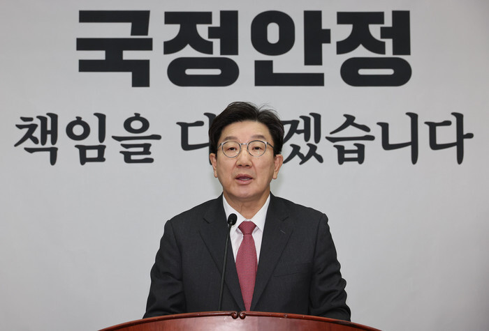 Kweon Seong-dong, floor leader of the ruling People Power Party, speaks during a meeting of the party's lawmakers at the National Assembly in Seoul on Jan. 8, 2025. (Yonhap)