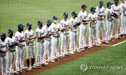 | ▲ 홀로 마스크 쓰지 않은 알테어 (서울=연합뉴스) 임헌정 기자 = 17일 오후 서울 구로구 고척스카이돔에서 열린 2020 KBO리그 한국시리즈 1차전 두산 베어스와 NC 다이노스의 경기. NC 선수들이 경기 시작 전 '덕분에' 포즈를 취하고 있다. 2020.11.17 kane@yna.co.kr |