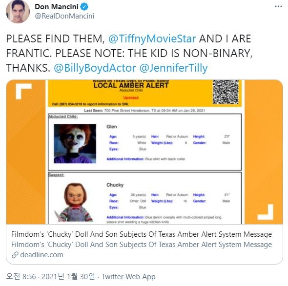 처키 원작자인 돈 맨시니는 지난달 30일 자신의 트위터 계정에 "이들을 제발 찾아달라"고 쓰기도 했다.