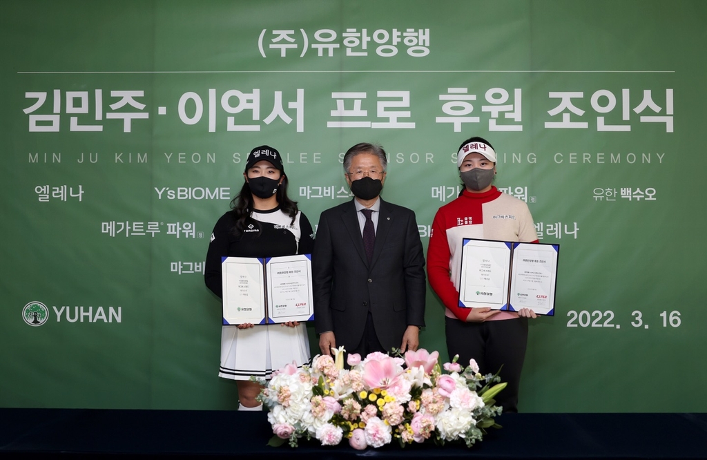 후원 조인식은 16일 오후 서울 동작구 유한양행 본사 대회의실에서 열렸으며 김민주와 이연서는 앞으로 2년간 모든 대회에 유한양행 브랜드 로고를 달고 출전한다.