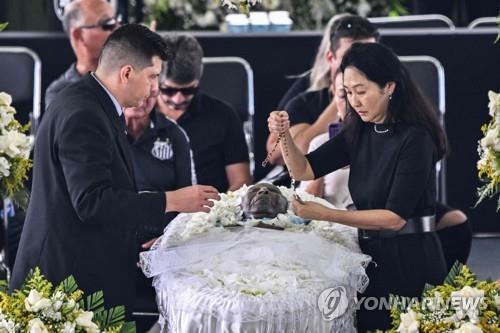 | ▲ 펠레의 관 위에 묵주를 얹고 있는 부인 마르시아 아오키 (산투스[브라질 상파울루주] AFP=연합뉴스) 축구황제 펠레의 부인 마르시아 아오키(오른쪽)가 2일(현지시간) 산투스 빌라 베우미루 경기장에 안치된 펠레의 관 위에 묵주를 놓고 있다. 2023.1.3. |