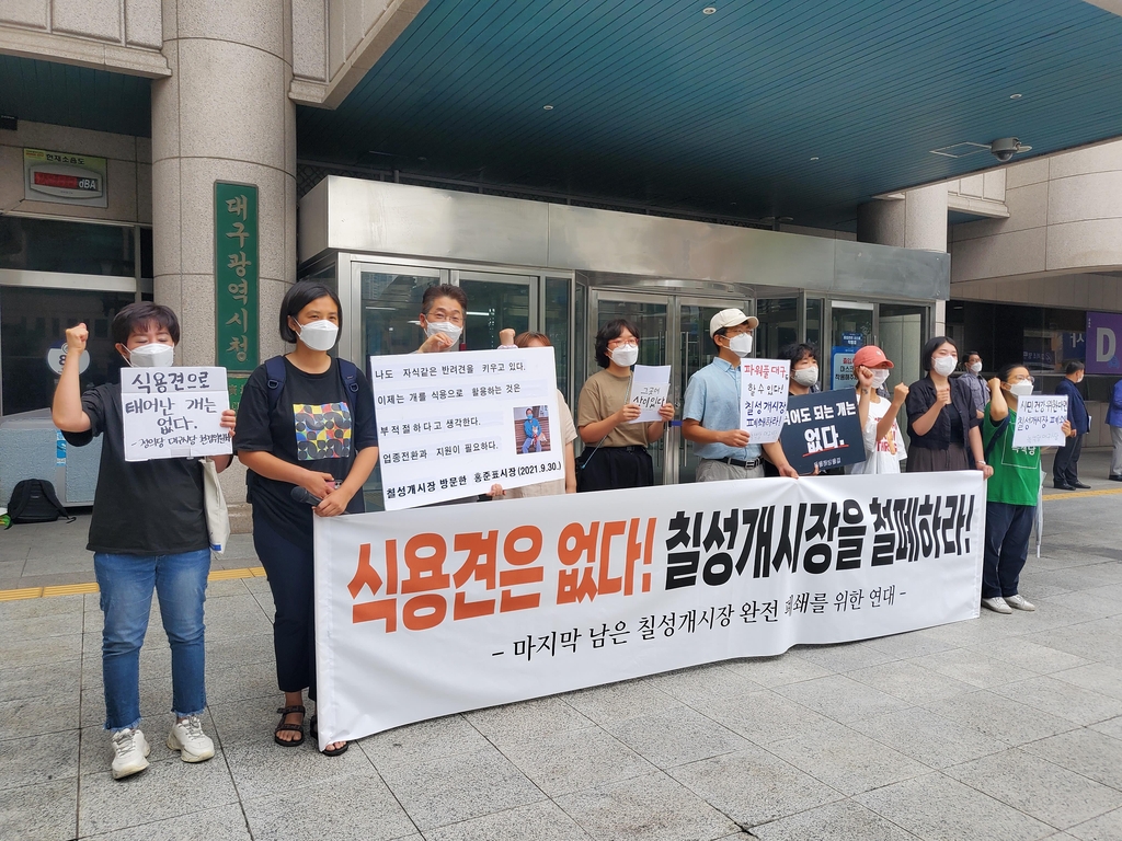 '마지막 남은 칠성개시장 완전 폐쇄를 위한 연대'는 13일 중구 동인동 대구시청 앞에서 기자회견을 열고 "칠성개시장을 하루속히 완전히 폐쇄하라"며 "칠성개시장 내 모든 개 식용 상가를 포함한 전업 대책을 대구시는 수립해야 한다"고 밝혔다.