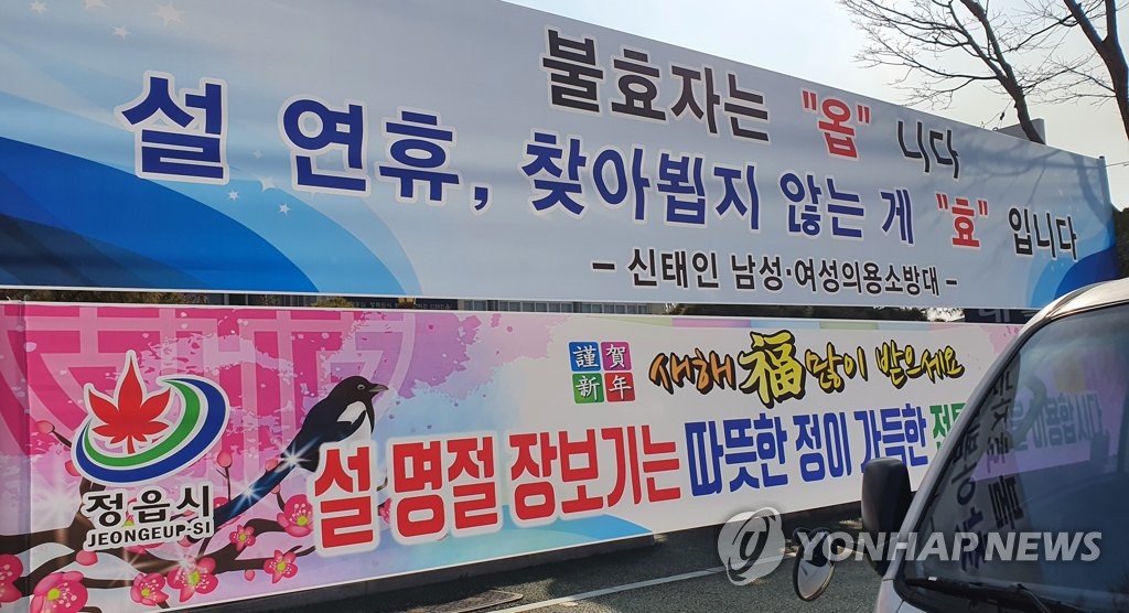 | ▲ "불효자는 '옵'니다" (정읍=연합뉴스) 김동철 기자 = 27일 오후 전북 정읍시 신태인읍사무소 앞에 설 명절 귀성 자제를 당부하는 플래카드가 붙어 있다. 2022.1.27 sollenso@yna.co.kr |