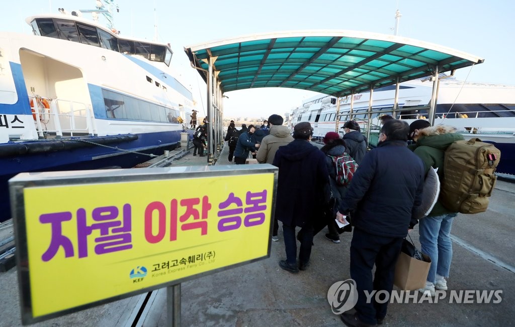 | ▲ '섬 고향으로 갑니다' (인천=연합뉴스) 윤태현 기자 = 설 연휴를 하루 앞둔 28일 오전 인천시 중구 인천항 연안여객터미널에서 귀성객들이 자월·이작·승봉도 등 섬 지역으로 가는 여객선에 타고 있다. 2022.1.28 tomatoyoon@yna.co.kr |