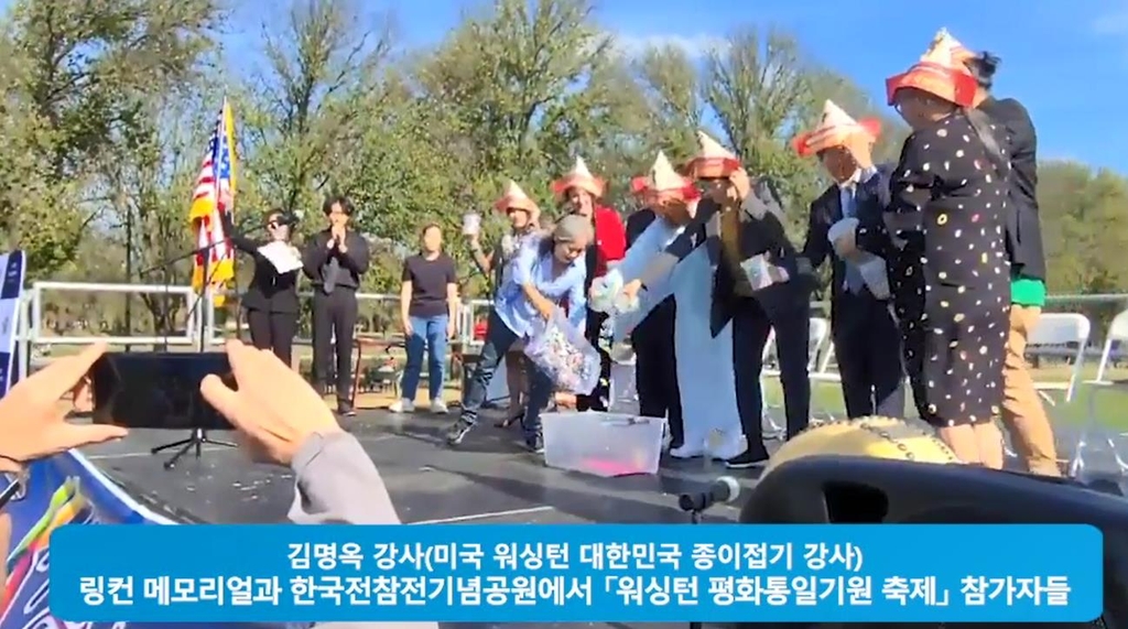 | ▲ 미국 워싱턴의 평화통일 기염 축제에 참여한 한인과 현지인들 고깔 합지식 장면 [줌 화면 캡처] |