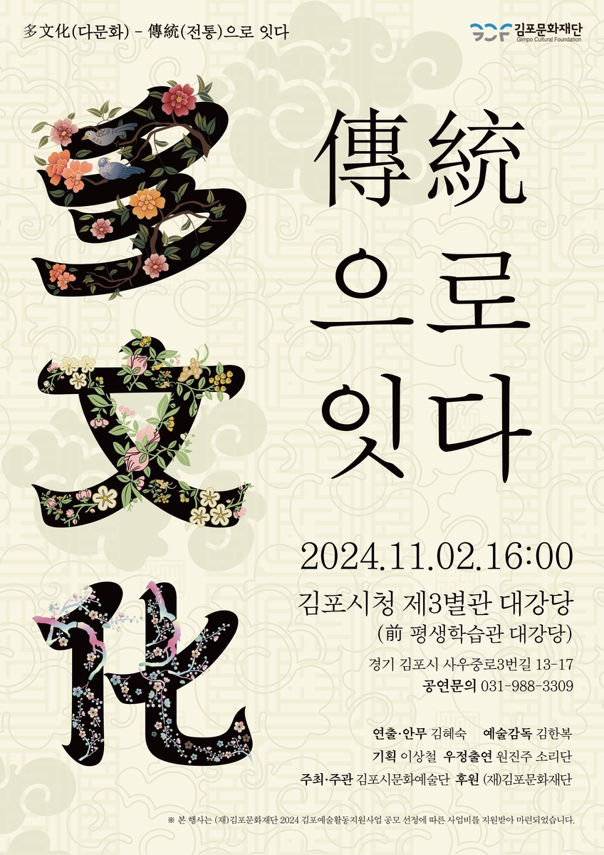 (서울=연합뉴스) 성도현 기자 = 김포시문화예술단은 다음 달 2일 경기 김포시청 제3별관 대강당에서 '다문화 - 전통으로 잇다' 공연을 개최한다고 24일 밝혔다.