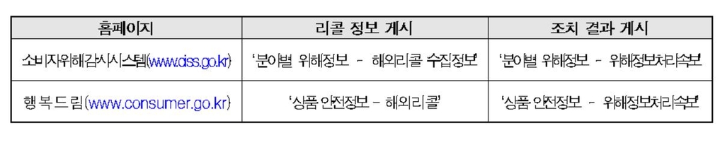 해외리콜제품 정보는 소비자위해감시시스템(www.ciss.go.kr)과 열린소비자포털 행복드림(www.consumer.go.kr)에서 확인할 수 있다.