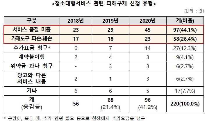 | ▲ 청소대행서비스 관련 소비자 피해구제 신청 유형 [한국소비자원 제공. 재판매 및 DB 금지] |