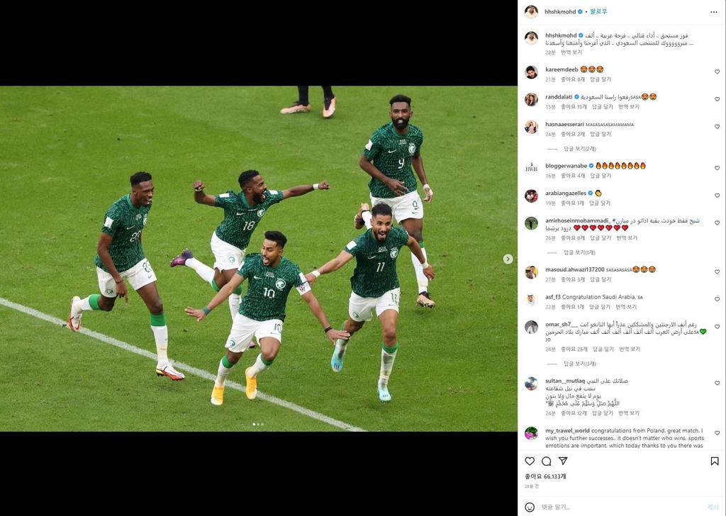 "아랍에 기쁨을 준 사우디아라비아를 축하한다. 우리를 행복하게 해줬다"는 말은 이번 경기가 가진 의미를 상징적으로 보여준다.