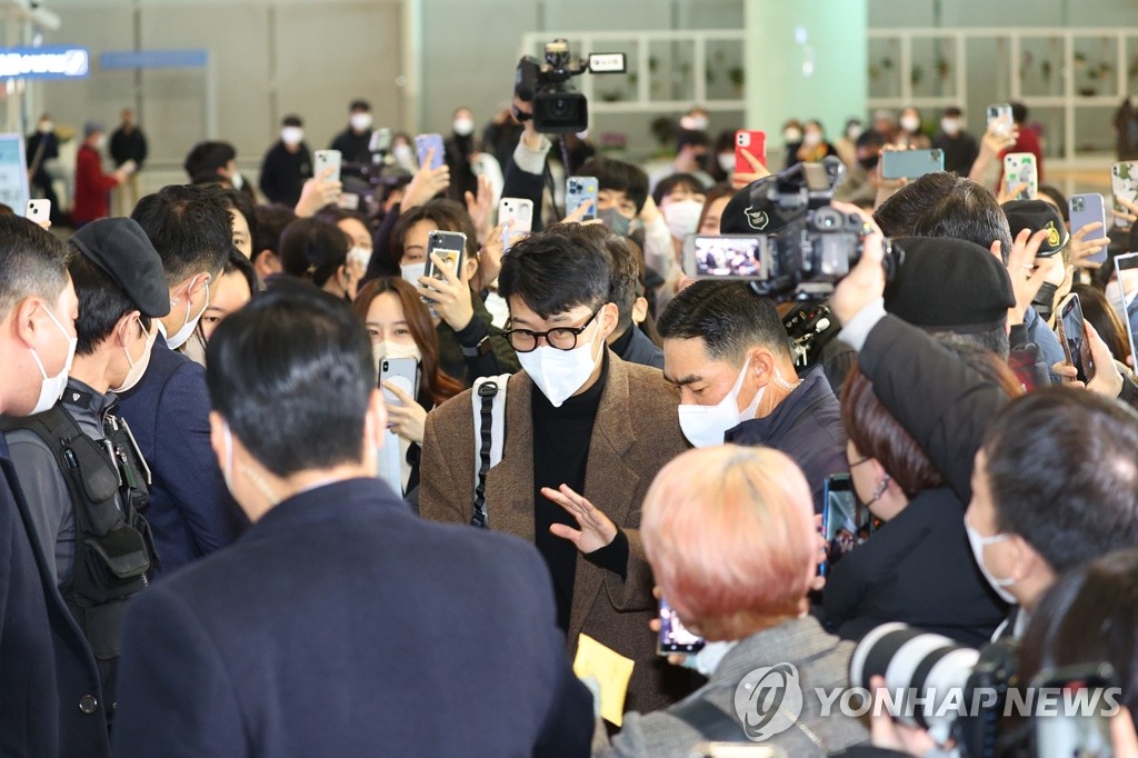 갈색 롱코트를 입고 검은 뿔테 안경을 낀 그는 출국장에 들어서자마자 앞쪽에 선 팬들부터 차례차례로 사인을 해줬다.
