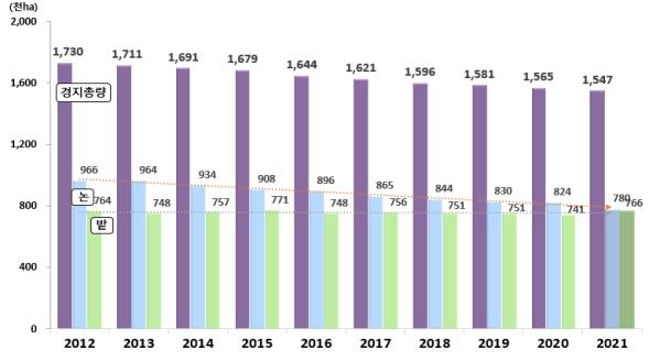 전체 경지면적은 154만6천717㏊로 전년보다 1.2% 감소했다. 경지면적 감소는 2013년 이후 9년째 계속되고 있다.
