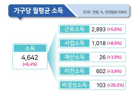 외부에서 들어오는 이전소득(60만2천원)도 3.9% 늘었는데, 특히 정부가 지급하는 공적 이전소득이 10.7% 증가했다.