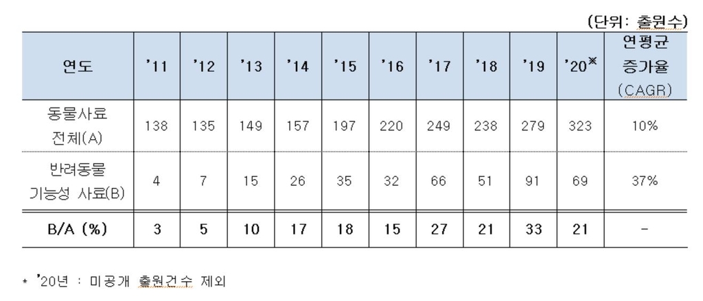 | ▲ 동물사료 및 반려동물용 기능성 사료 출원 동향 [특허청 제공. 재판매 및 DB 금지] |