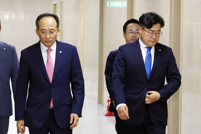 Rep. Choo Kyung-ho (L), floor leader of the ruling People Power Party, and his main opposition Democratic Party counterpart, Park Chan-dae, look gloomy at the National Assembly in Seoul on June 5, 2024, as their negotiations failed on how to divide the committees of the newly launched 22nd parliament. (Yonhap)