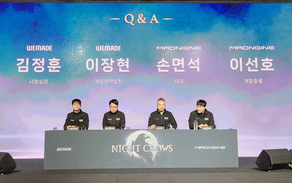 | ▲ '나이트 크로우' 개발·운영진 질의응답 (서울=연합뉴스) 김주환 기자 = 위메이드·매드엔진 관계자들이 16일 서울 강남구 아모리스에서 열린 신작 게임 '나이트 크로우' 쇼케이스 행사에서 취재진 질문에 답하고 있다. 2023.3.16 jujuk@yna.co.kr |