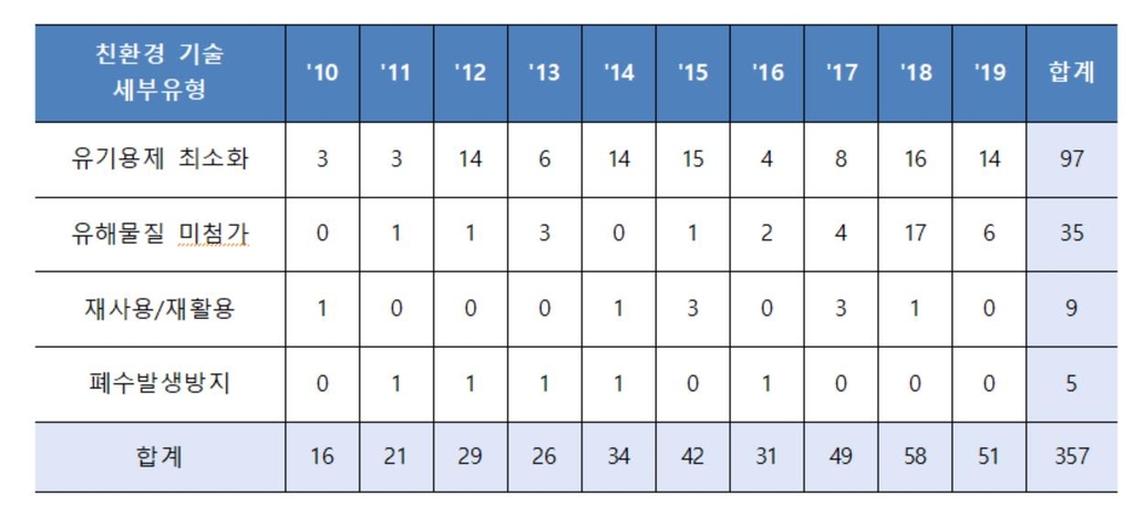 친환경 기술은 유기용제 최소화 기술(97건), 유해 물질 미첨가 기술(35건), 재사용·재활용 기술(9건), 폐수 발생 방지 기술(5건) 순으로 출원됐다.