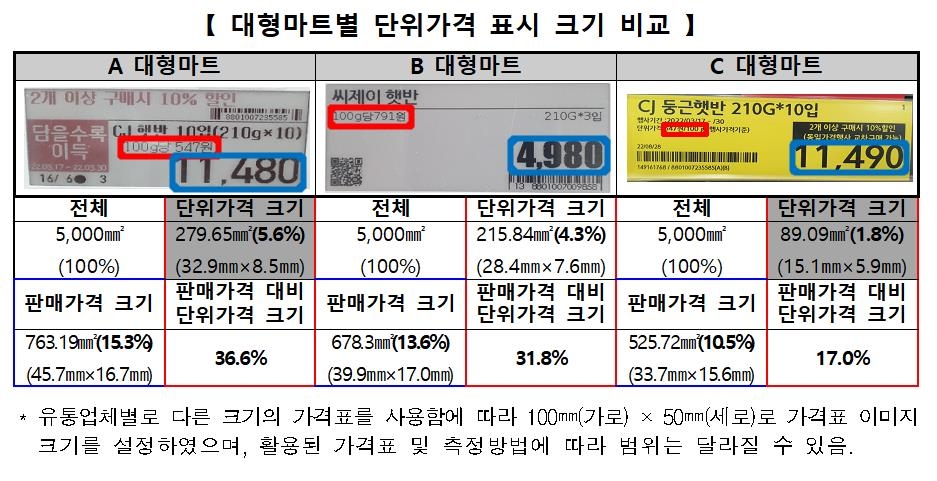 실제 대형마트 3사의 가격표시 실태를 조사한 결과 전체 가격표 크기에서 단위가격 표시 비중은 1.8∼5.6%에 그쳤다.
