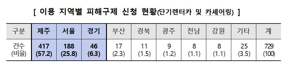 12개월 이상 장기로 이용하는 장기 렌터카 관련 피해를 제외하고 단기 렌터카와 카셰어링 관련 사건으로 한정할 경우 729건 중 제주 지역에서 발생한 피해가 57.2%(417건)로 절반을 넘었다.