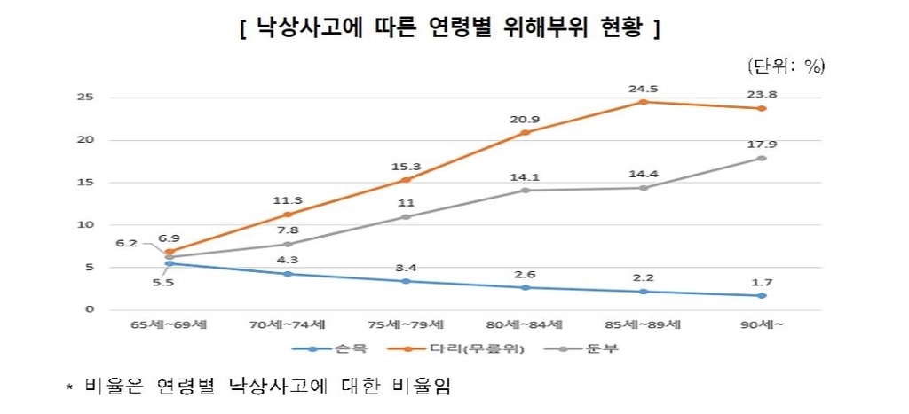연령별로는 75∼79세(3천248건), 80∼84세(3천223건), 70∼74세(2천703건) 순으로 낙상사고가 많았고, 성별로는 여성의 낙상사고가 남성보다 2배가량 많았다.