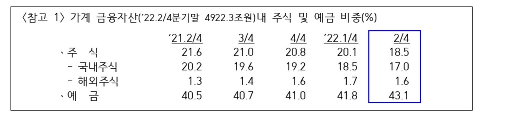 이에 따라 지난해 2분기 21.6%로 역대 최대 수준에 이르렀던 가계 금융자산 내 주식·투자펀드의 비중은 올해 2분기 18.5%까지 떨어졌다. 반면 예금(43.1%) 비중은 1년 전(40.5%)이나 직전 분기(41.8%)보다 늘었다.