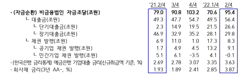 원자재 가격 상승 등으로 운전자금 수요가 늘었지만, 회사채 시장 자금조달 여건이 나빠지면서 기업들이 단기 대출 중심으로 자금 조달 규모를 늘렸기 때문이라는 게 한은의 설명이다.