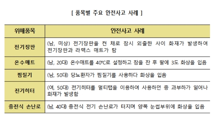 품목별로는 전기장판(311건)이 가장 많았고, 이어 온수매트(95건), 찜질기(66건), 전기난로(37건), 온열 용품(20건), 전기 온풍기(9건), 전기방석(8건), 충전식 손난로(7건) 등의 순이었다.