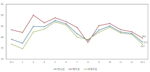 업종별로 보면 제조업이 79.6으로 2.9p 내렸고 비제조업은 76.7로 4.6p 하락했다. 비제조업 중 건설업(74.2)은 4.4p, 서비스업(77.2)은 4.6p 내렸다.