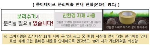 25개 종이테이프 제품의 분리배출 안내 내용을 조사한 결과 19개 제품(76%)이 온라인 광고에 '박스에 부착된 상태로 재활용', '분해되는 종이로 재활용 가능' 등 잘못된 방법을 안내하고 있다고 소비자원은 지적했다.